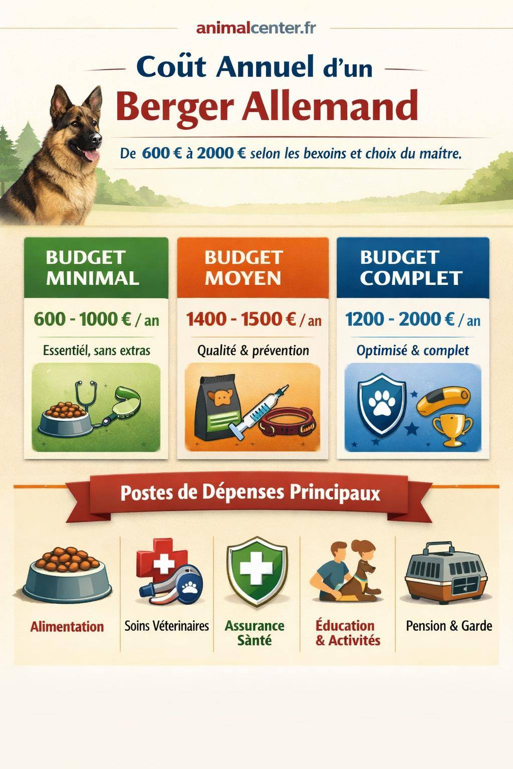 | Budget complet recommandé | 1200 – 2000 € / an | Approche globale : alimentation optimisée, prévention renforcée, éducation, activités et assurance santé |